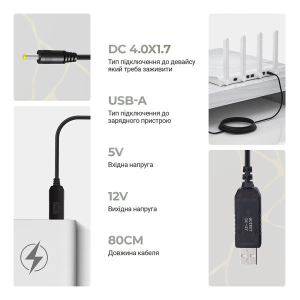 Основні характеристики:Сумісність: для роутерів, ламп, камер та інших пристроїв із роз'ємом DC 4.0x1.7 мм.Живлення: підтримка напруги 12V через USB.Довжина: 0.8 м — оптимально для компактного підключення.Колір: чорний — універсальний та стильний дизайн для будь-якого середовища.Міцність: виготовлений із якісних матеріалів для тривалого використання.