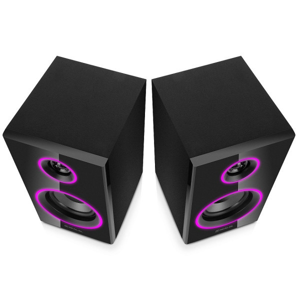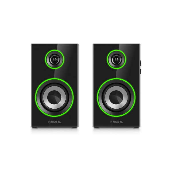 Акустична система REAL-EL S-415 — 2.0 колонка для ПК, домашнього використання чи телевізора з потужністю 20 Вт, Bluetooth та проводовим підключенням через mini-jack 3.5 мм. Корпус з дерева (MDF) підсилює акустику, а RGB-підсвітка створює атмосферу.