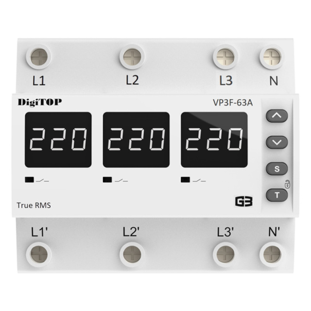 Трифазне реле напруги VP-3F63А M6W призначене для захисту трифазних споживачів від перепадів напруги, асиметрії фаз, зникнення фаз.