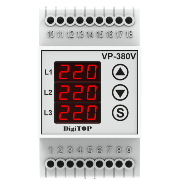 Трифазне реле напруги VP-380A призначене для захисту трифазного електрообладнання від неприпустимих перепадів напруги, асиметрії фаз, зникнення фаз, контролю порядка чергування фаз. Пристрій запобігає виходу з ладу і продовжує термін експлуатації електрообладнання.