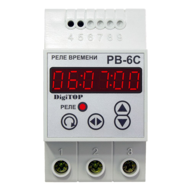 Реле часу РВ-6С призначене для автоматичного включення і відключення виконавчих пристроїв (системи поливу, освітлення і т.д.) в задані користувачем моменти астрономічного (реального) часу. Користувач може встановити до 99 міток (вмикання або вимикання) на добу.