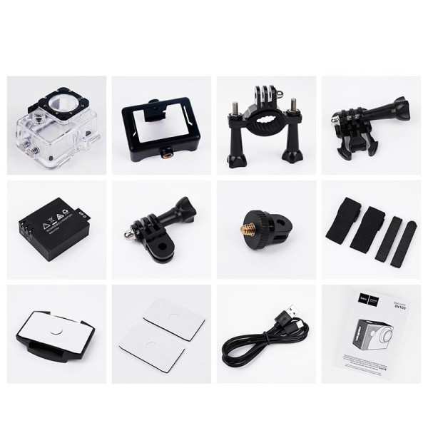 Екшн-камера HOCO DV100 — компактна спортивна камера для зйомки у Full HD (1080p/30fps) з надшироким кутом огляду 150°. Має 2" IPS-дисплей і підтримує Wi-Fi та керування через застосунок. У комплекті є водонепроникний бокс (до 30 м) та набір кріплень — зручно для велосипеда, шолома чи активного відпочинку.