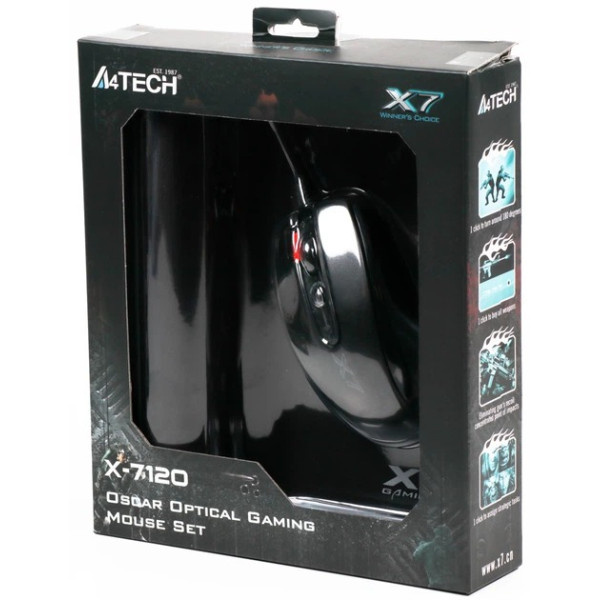 Ігровий набір A4Tech: миша X-710BK (USB) + килимок X7-200MP. Миша з перемиканням DPI 400/800/1200/1600/2000 та 7 кнопками (6+колесо). Килимок розміром 250×200×3 мм з тканинною поверхнею та нековзною гумовою основою — для точного та плавного керування в іграх і роботі.