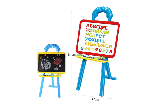 Це двосторонній дитячий мольберт, який дозволяє писати крейдою та кріпити магнітні елементи (літери, цифри).
