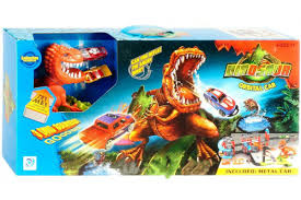 Ігровий набір представляє собою автотрек із кількома рівнями, спусками, поворотами та механізмом запуску машинок. Центральний елемент – фігурка динозавра, яка ловить машинки, випущені з гармати. Динозавр озвучений англійською мовою, присутні звукові ефекти, що додає інтерактивності й захопливості в процесі гри.